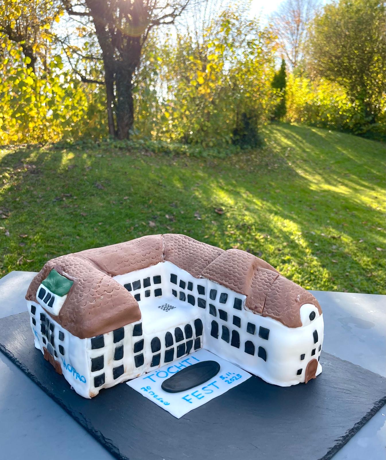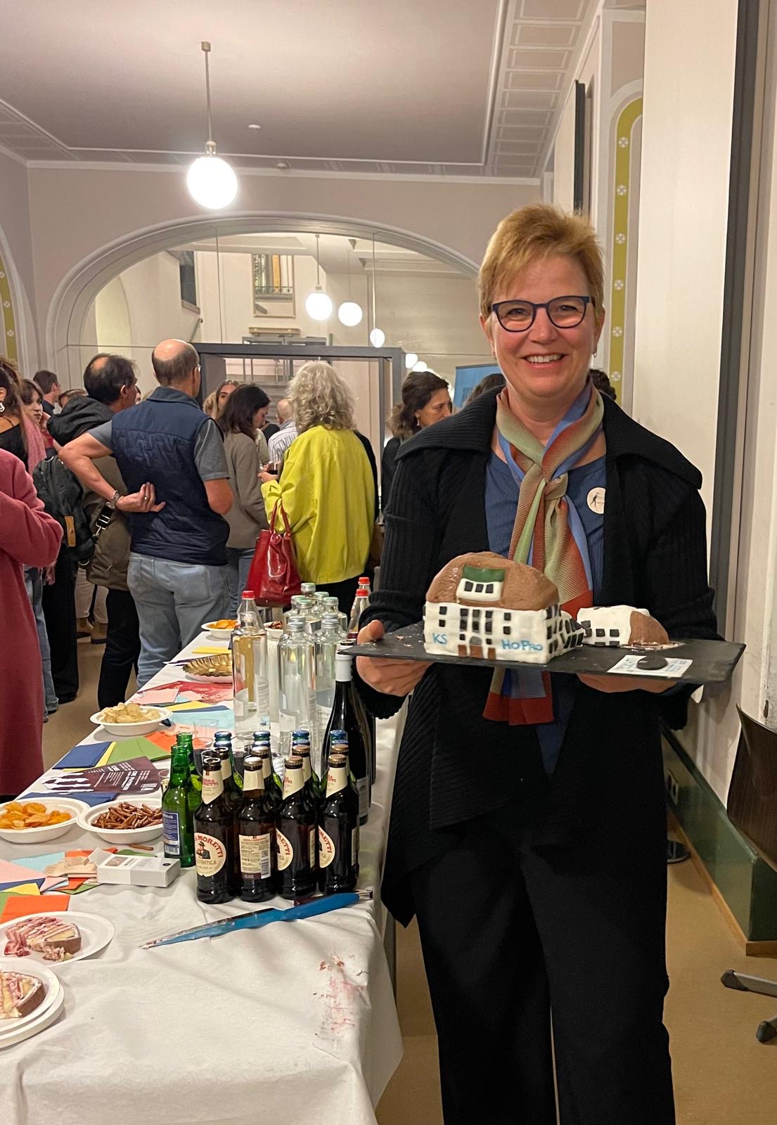 Beim anschliessenden Apéro sorgte die HoPro-Torte von Bettina Leu-Laib (Maturjahrgang 1988) für Aufsehen. Das kunstvolle Werk zeigte das Schulhaus im Miniaturformat. Die Idee entstand bereits während des Lockdowns 2020, als sie mit ihrer Familie bei einer Kuchen-Challenge der HoPro mitmachte und den ersten Preis gewann. Das Fazit der Gäste: nicht nur optisch, sondern auch geschmacklich ausserordentlich gelungen!
