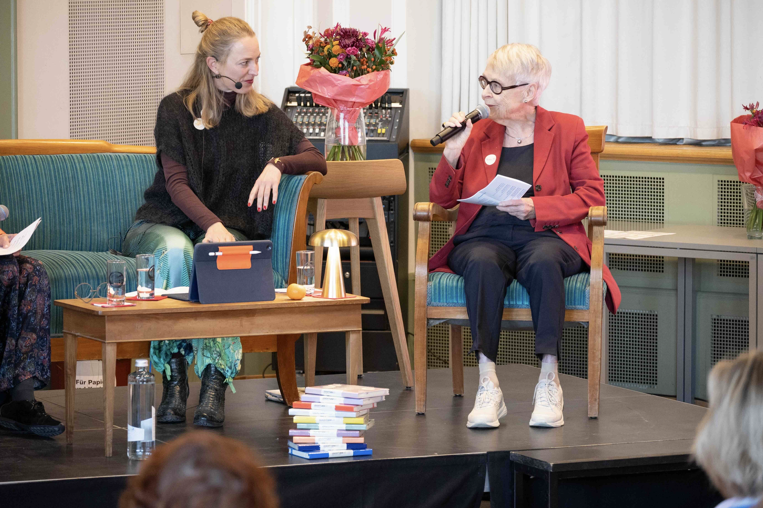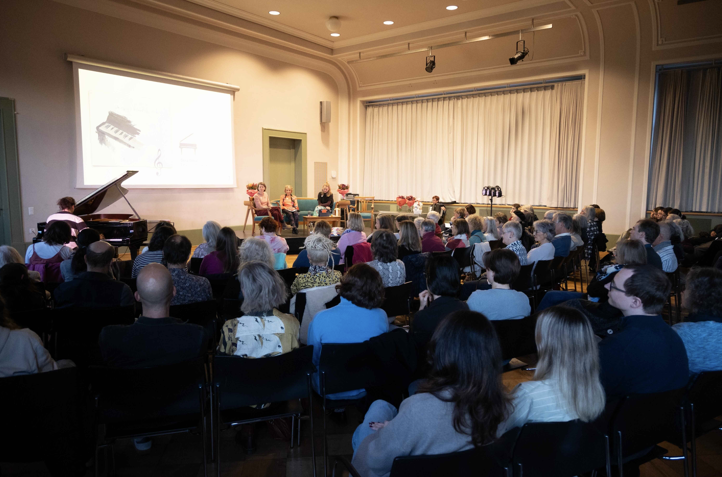 Auf einem Sofa auf der Bühne erzählten die drei mit verschiedenen Gästen von Erinnerungen an das Fest von damals. Immer wieder kamen auch Meldungen und Anekdoten aus dem Publikum, die den Abend lebendig und persönlich machten. Unter ihnen befand sich auch Klara Obermüller (Maturjahrgang 1959), Zeitzeugin der Feier von damals, die von ihrem damaligen Auftritt erzählte und Bilder aus ihrem Fotoalbum mitbrachte.
