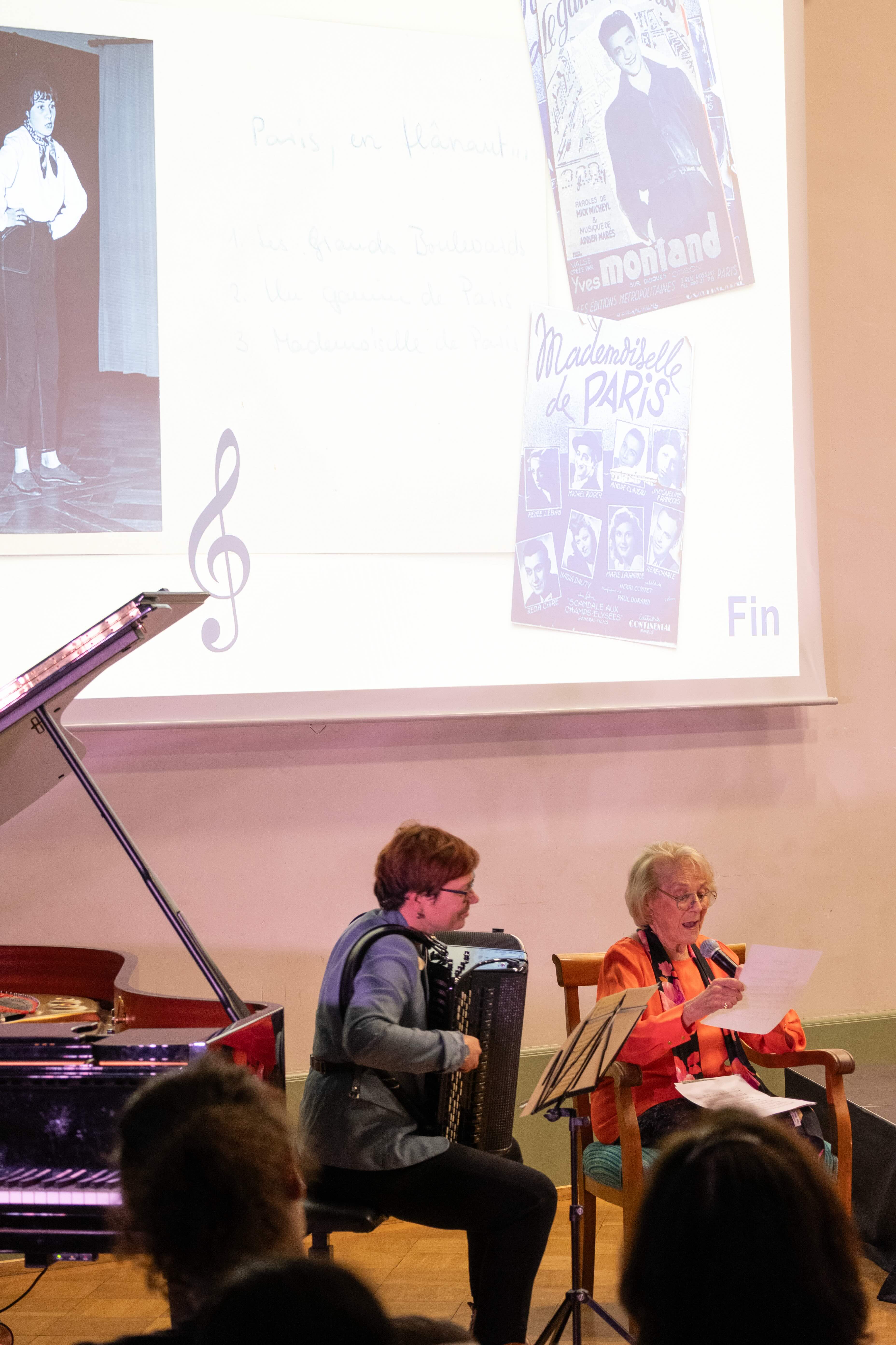 Zum Abschluss sang Heidi Diggelmann, begleitet von Yvonne Glur am Akkordeon, drei französische Chansons, die sie bereits 1955 vorgetragen hatte. Ihr Auftritt löste grosse Begeisterung aus und wurde mit langem Applaus gefeiert.